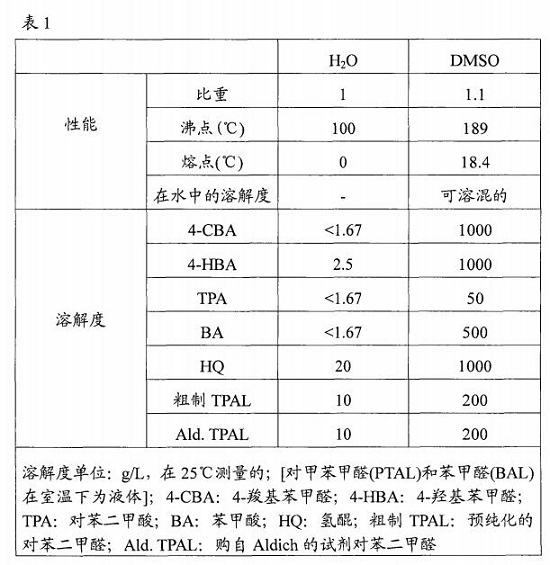 在此作為溶劑使用的二甲基亞砜和水的物理性能,以及對(duì)苯二甲醛和主要雜質(zhì)在它們中的溶解度如下表1所示。